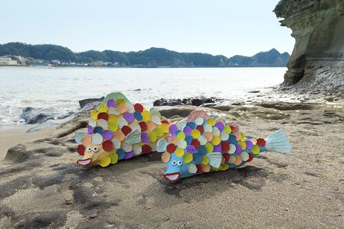 木暮奈津子です。新聞紙のオブジェを海で撮影しています。