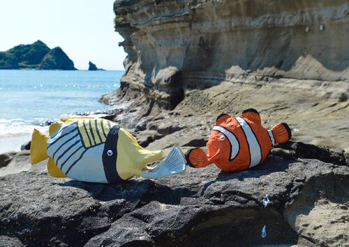 木暮奈津子です。新聞紙のオブジェを海で撮影しています。