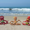 木暮奈津子です。新聞紙のオブジェを海で撮影しています。